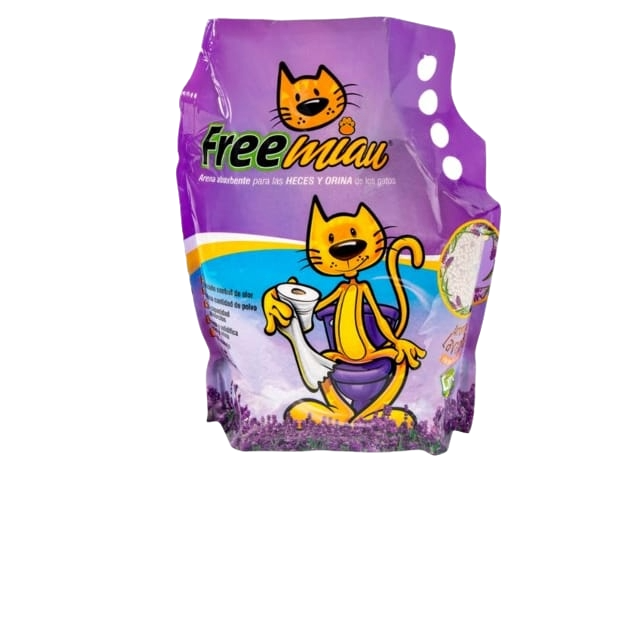 Arena Free Miau con bentonita 100% natural, fácil de limpiar. Neutraliza el 99% del polvo, con una excelente capacidad de aglomeración y camufla el olor de manera agradable.