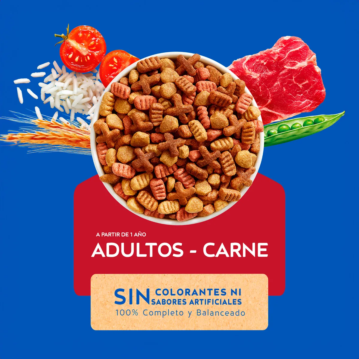 Maíz, concentrado proteico de maíz, harina proteica de pollo harina de carne y hueso (vacuno y/o porcino), harina de pescado y/o harina de alga (schizochytrium ssp.) como fuente de ácidos grasos omega 3, trigo, harina de soya y/o concentrado proteico de soya, grasa (vacuna y/o porcina y/o avícola y/o pescado y/o vegetal) estabilizada con antioxidantes (bht) como fuente de omega 6, pirofosfato tetra sódico (tspp), arroz, hidrolizado a base de hígados de pollo y/o cerdo, tomate deshidratado, arveja deshidratada, sal, cloruro de potasio, ácido fosfórico y/o bisulfato de sodio, carbonato de calcio y/o fosfato bicálcico, vitaminas [a, b1, b2, b3, b5, b6, b7, b9, b12, c, d3, e, k3], cloruro de colina, inulina (prebiótico), aminoácidos (lisina, metionina, taurina), minerales [sulfato de zinc, proteinato de zinc, sulfato de hierro, proteinato de hierro, sulfato de manganeso, proteinato de manganeso, sulfato de cobre, proteinato de cobre, yodato de calcio, selenito de sodio, proteinato de selenio], colorantes naturales (caramelo, carmín), levadura seca de cervecería (saccharomyces cerevisiae ssp.).
