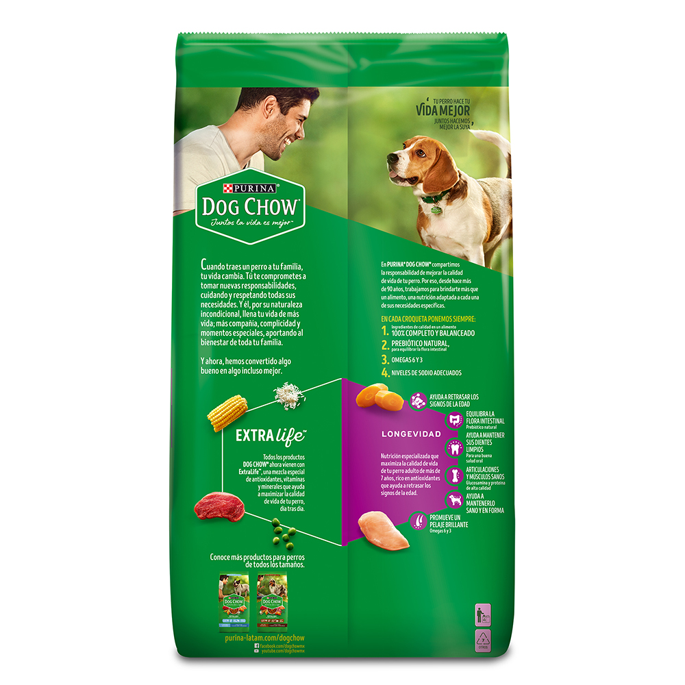 dog chow ahora vienen con extralife una mezcla especial con antioxidantes, vitaminas y minerales que ayuda a maximimar la calidad de vida de tu perro día tras día. Alimento completo para perros adultos de edad avanzada (mayores de 7 años) de todos las razas.
