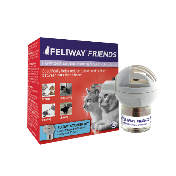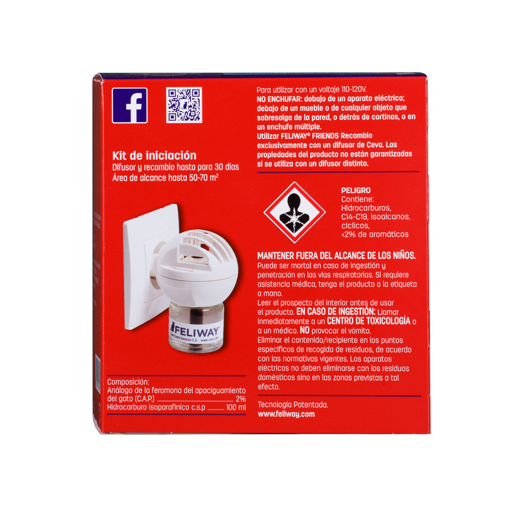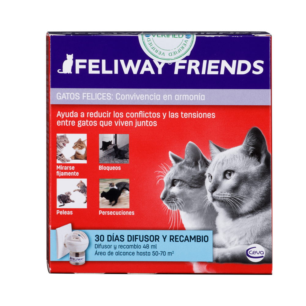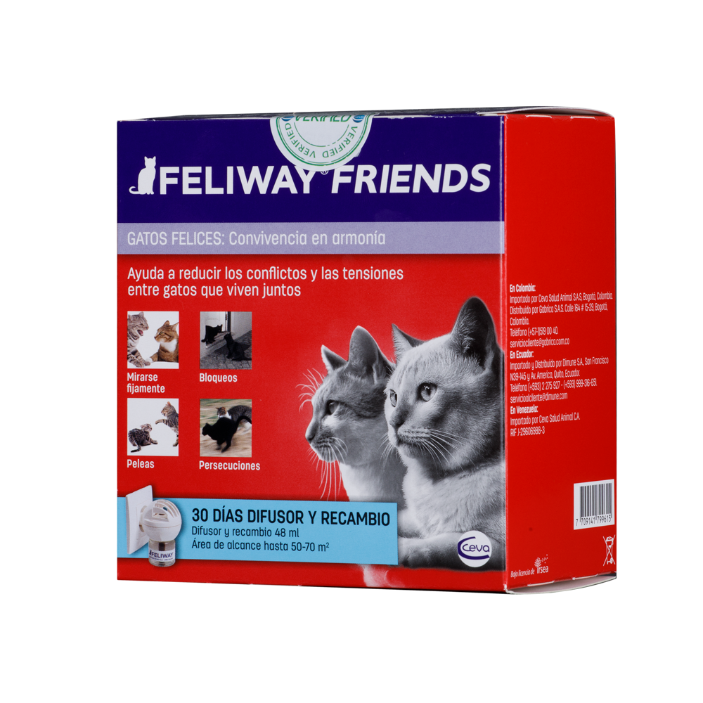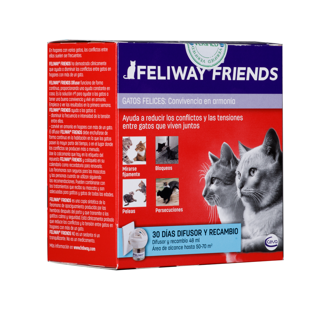 El difusor FELIWAY®-FRIENDS debe mantenerse enchufado de forma continua en la habitación en la que los gatos pasen la mayor parte del tiempo y donde se dan los conflictos. No enchufar debajo de aparatos eléctricos, muebles u objetos colgados en la pared, ni tampoco a un ladrón o alargador. Adecuado solo para recargas FELIWAY®. Las características del producto no pueden garantizarse si la recarga se utiliza con otro difusor. Mantener fuera del alcance de los niños. Leer las instrucciones de uso antes de utilizar el producto.