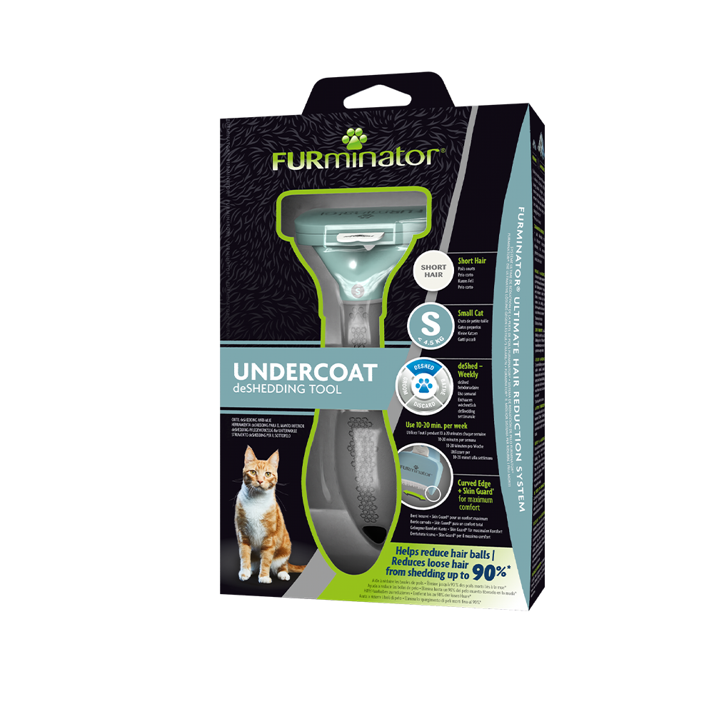 La herramienta FURminator Undercoat deShedding para gatos pequeños con pelo corto elimina hasta el 90% del pelo suelto procedente de la muda. Además, ayuda a reducir las bolas de pelo. Úselo 1 o 2 veces a la semana en sesiones de 10 a 20 minutos sobre el pelo seco.