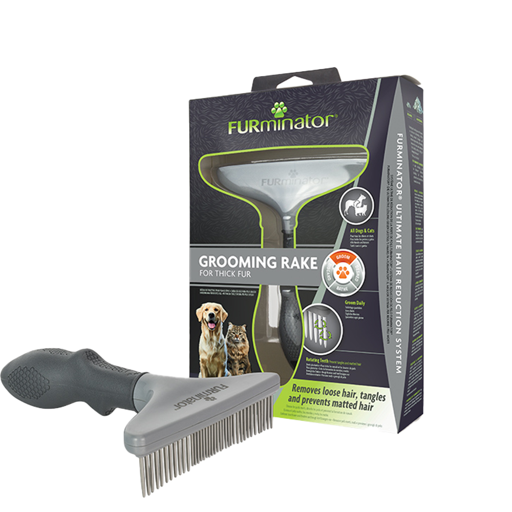 El Furminator rastrillo Grooming Rake FURminator para mascotas con el pelo espeso elimina el pelo suelto, los enredos y evita los nudos. Úselo a diario de 5 a 10 minutos por sesión sobre el pelo seco.