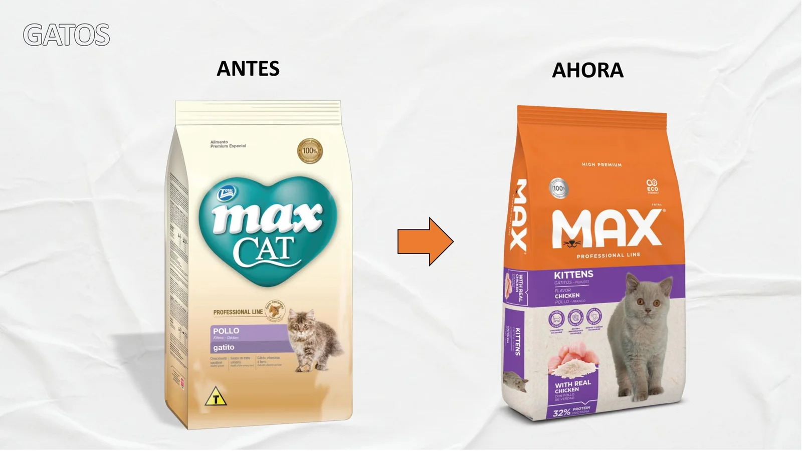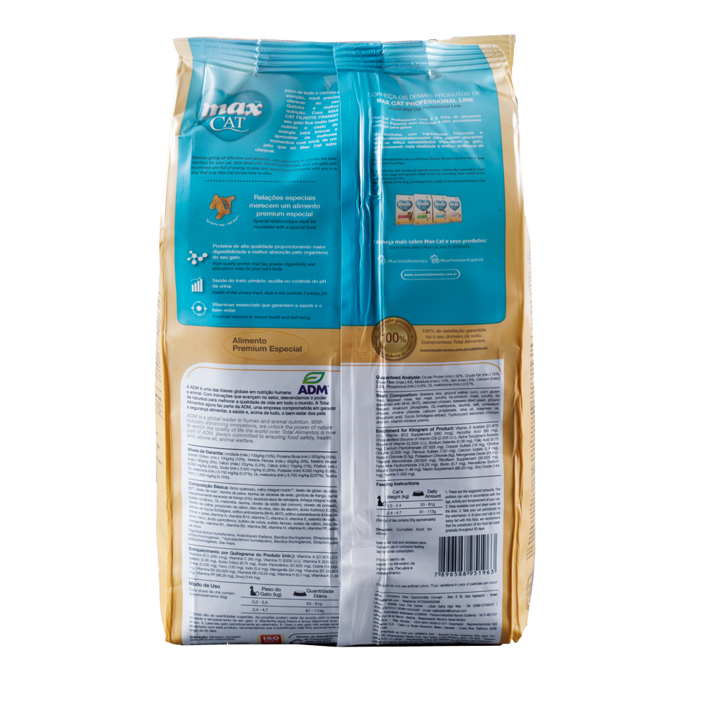 Arroz medio grano, Maíz integral molido, Afrecho de gluten de maíz 60, Afrecho de soja, Harina de pescado, Harina de menudos de pollo, Grasa de pollo, Carne mecánicamente separada de pollo, Levadura seca de cervecería, Semilla de linaza, Fosfato dicálcico, DL-metionina, Taurina, Cloruro de sodio (sal común), Cloruro de potasio, Cloruro de colina, Propionato de calcio, Aceite de oliva, Aceite de romero, Ácido fosfórico, Extracto de Yucca schidigera, Aditivo antioxidante (BHA, BHT), Hidrolizado de pollo y pescado, Suplemento vitamínico mineral