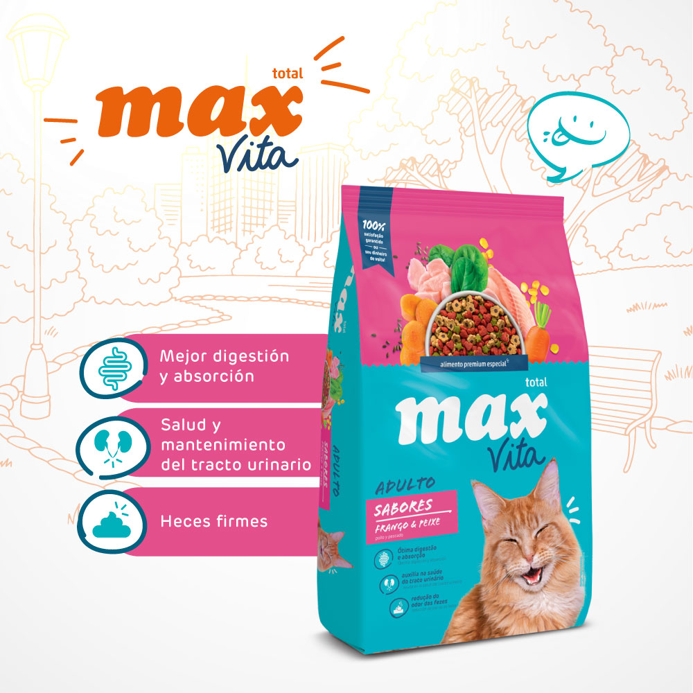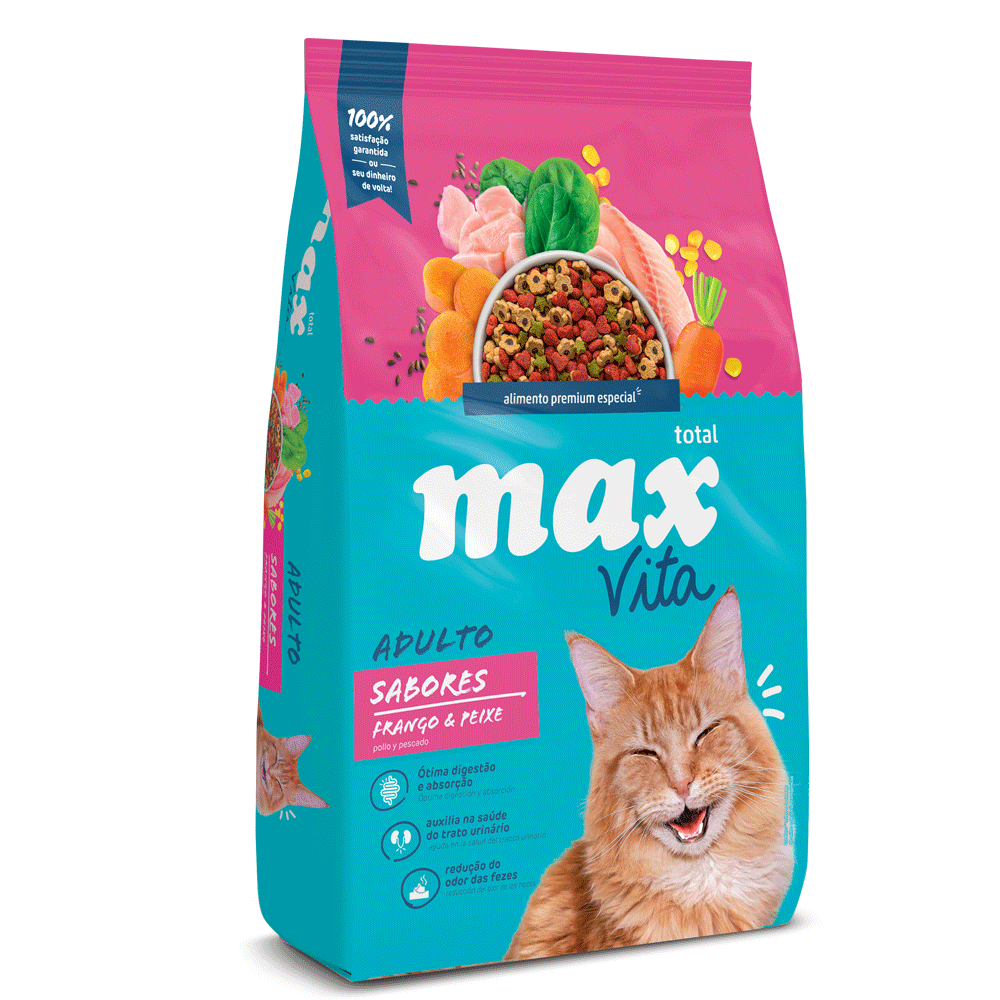 Farinha de entrañas de ave (2%), Millho entero molido**, Milho de germen cebado**, Farelo de milho sin gluten**, Arroz partido, Farelo de soja*, Frango graso, Aceite de pescado refinado, Farinha de peixe (0,15 %), Levadura cervejaria deshidratada, Espinaca deshidratada (0,02%), Cenoura deshidratada (0,02%), Moída integral Linhaça, Fosfato dicálcico, Cloruro de sodio (sal común), Potasio, Taurina, DL-Metionina, Extracto de yuca (0,025%), Bisulfato de Sodio (0,6%), Cloruro de Colina, Propionato de Calcio, Dióxido de Titanio, Colorante Artificial Verde Musgo, Colorante Natural Caramelo, Colorante Artificial Vermelho 40, Aditivo Prebiótico (0,3%), Palatabilizante a base de frigado de frango, Vitamina A, Vitamina B12, Vitamina D3, Vitamina E, Selenito de sodio, Ácido fólico, Ácido pantoténico, Sulfato de cobre, Ferrosulfato, Yodato de calcio, Monóxido de manganeso, Vitamina B1, Vitamina B2, Vitamina B6, Vitamina H, Vitamina K3, Vitamina PP, Óxido de zinc.