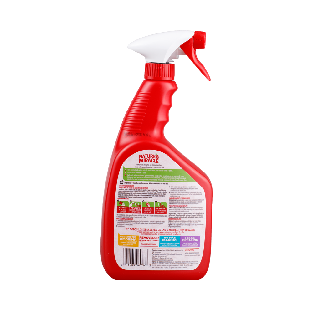 El Eliminador de manchas y olores Avanzado Aroma a limón de Nature’s Miracle trabaja para desalentar que el perro ensucie, al eliminar el olor de la suciedad de las mascotas. La fórmula a base de bacterias produce enzimas cuando está en contacto con material orgánico, para atacar los desastres severos de las mascotas, incluyendo orina, diarrea, vómitos y sangre. El eliminador de manchas y olores es seguro para usar en alfombras, pisos, muebles, telas y más, cuando se usa según las indicaciones. Deja un aroma fresco y ligero. La botella de spray lista para usar lo ayuda a trabajar de inmediato.