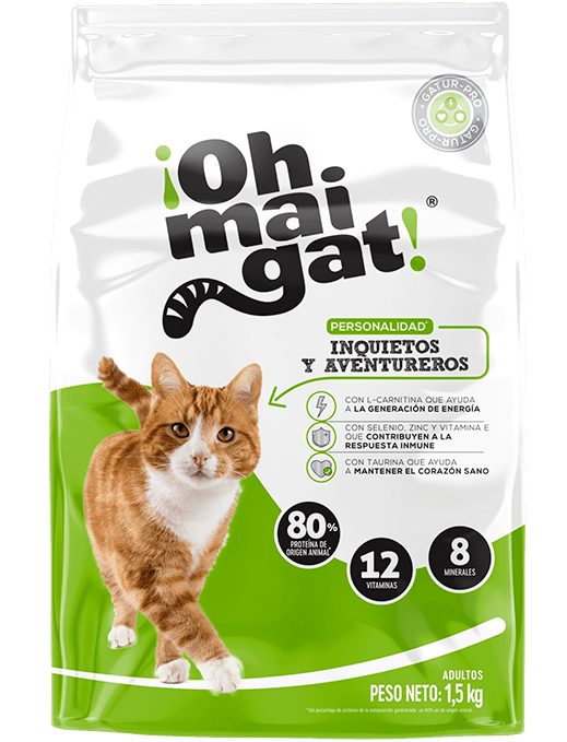 Subproductos de cereales (maíz, arroz partido), maíz y/o arroz, harina de carne y hueso y/o harina de cerdo, harina de vísceras de pollo, harina de pescado y/o harina de salmón, gluten de maíz y/o harina de soya y/o proteína aislada de soya y/o subproductos de cervecería, grasa (origen animal y/o origen vegetal) y/o ácido docosahexaenoico (DHA), hidrolizado de proteína animal, fibra soluble de maíz, premezcla de vitaminas y minerales (Vitamina A Retinol, Vitamina D Calciferol, Vitamina E Alfatocoferol, Vitamina K Fitomenadiona, Vitamina B1Tiamina, Vitamina B2 Riboflavina, Vitamina B6 Piridoxina, Vitamina B12 Cianocobalamina, Vitamina B3 Niacina, ácido pantoténico, ácido fólico, biotina y cloruro de colina, hierro (sulfato de hierro), cobre (sulfato de cobre), zinc (sulfato de zinc), selenio (selenito de sodio), yodo (EDDI), manganeso (sulfato de manganeso)), extracto de levadura (Saccharomyces cerevisiae), carbonato de calcio, zeolita, L-Carnitina, ácido fosfórico, sal, lisina, metionina, taurina, triptófano, treonina, yucca shidigera, fosfato cálcico, antioxidantes (Extracto de romero, propil galato, ácido cítrico, fosfato sódico, sílice coloidal, carbonato calcico), conservante (Ácido propiónico, propionato sódico, propionato amónico, ésteres de propilenglicol).