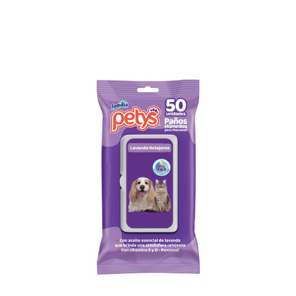 Paños húmedos extrasuaves y resistentes con aroma a lavanda, que contienen ingredientes limpiadores e hidratantes que no alteran la piel de tu mascota.