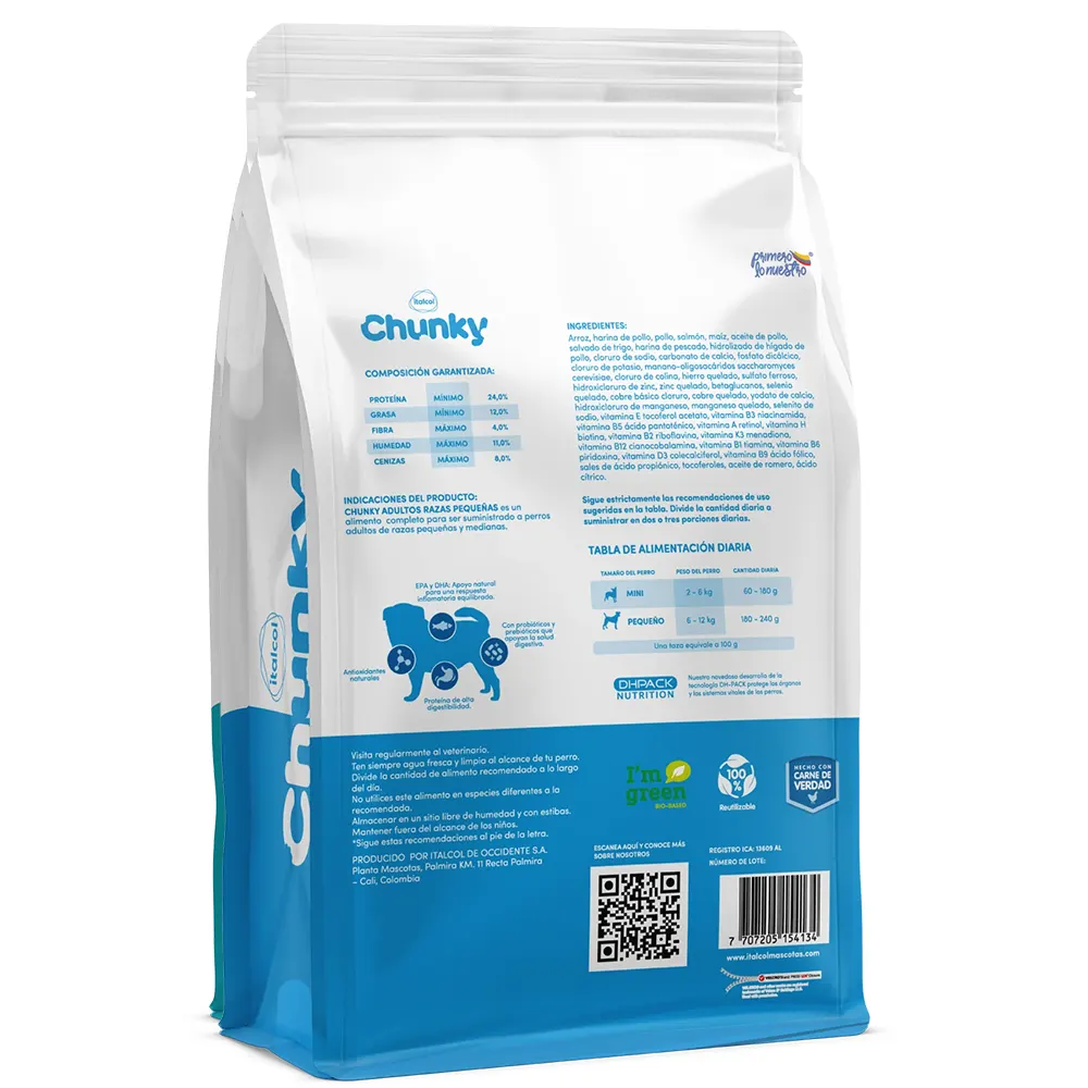El Alimento para perro raza pequeñas Chunky pollo ha sido desarrollado bajo estándares de calidad que garantizan una nutrición equilibrada.