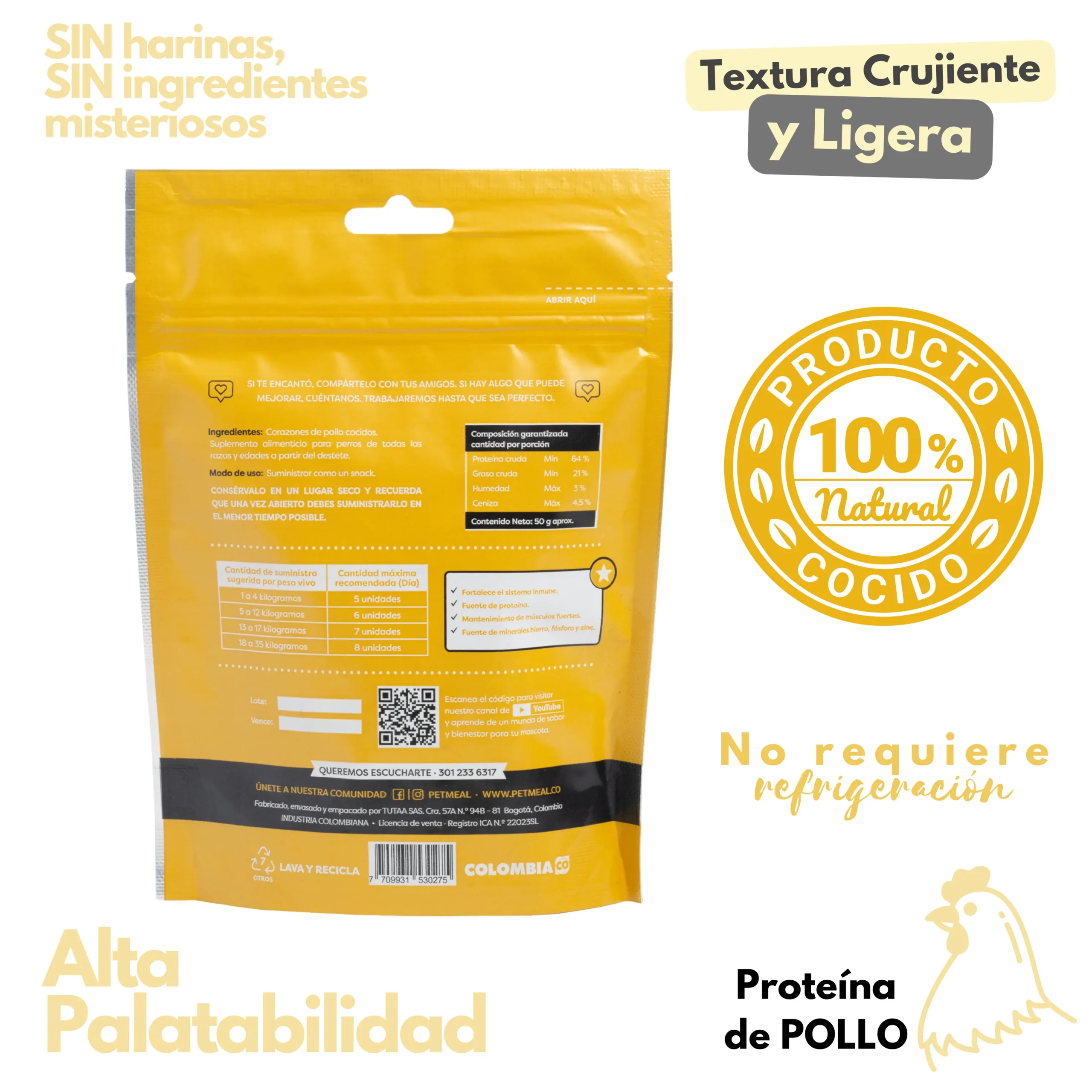Incorporar el Petmeal snack para perro corazones de pollo en tu rutina diaria no solo fortalece el vínculo con tu mascota, sino que también promueve hábitos de alimentación saludables, brindando un aporte adicional de proteínas animales de excelente digestibilidad. Este producto está elaborado bajo estrictos estándares de calidad y seguridad alimentaria, garantizando que cada bocado sea confiable y adecuado para el consumo regular.