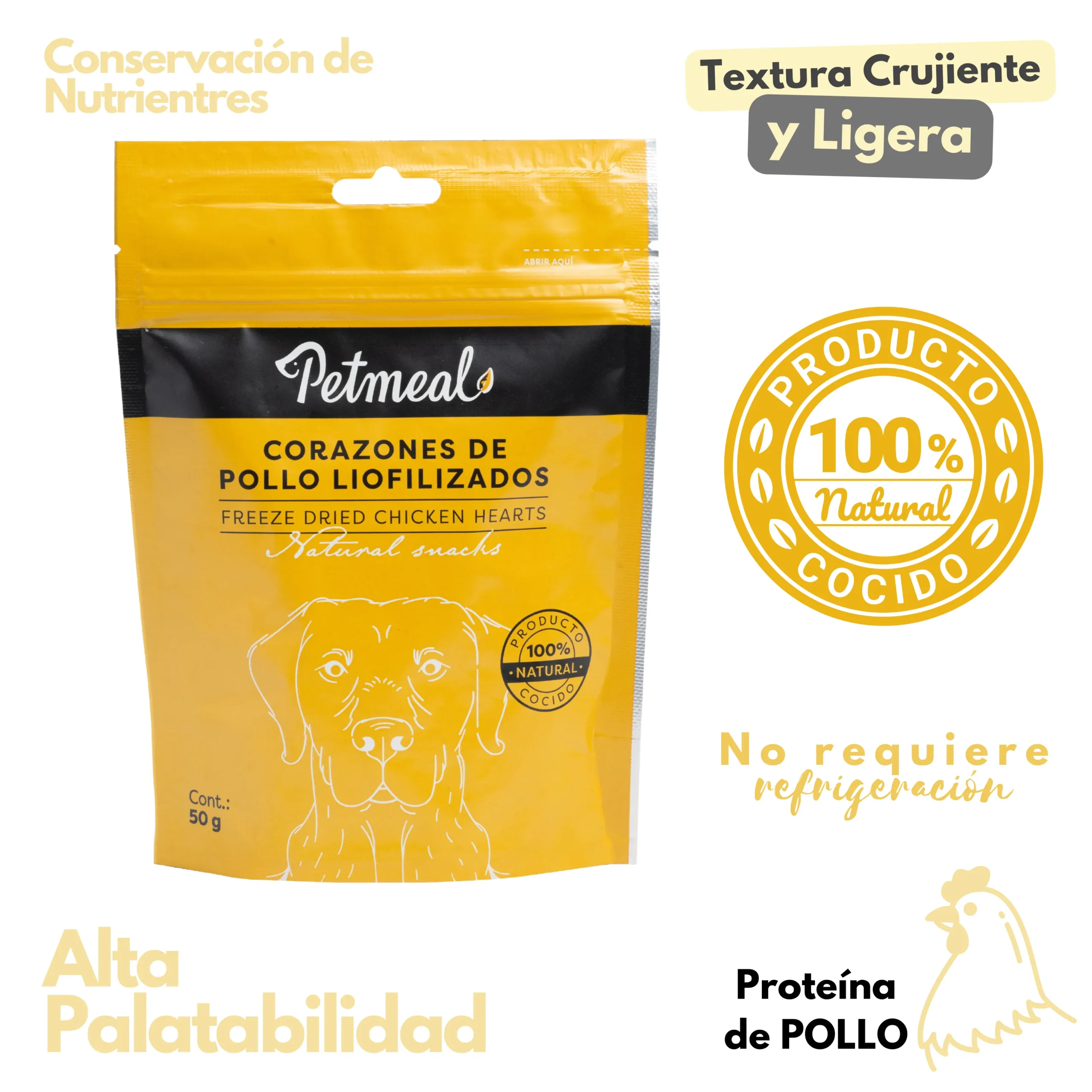 Petmeal snack liofilizado para perros,corazones de pollo, natural y nutritivo. Ideal como premio saludable, rico en proteínas y sabor irresistible.