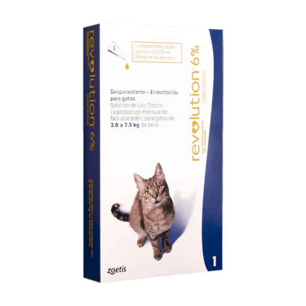REVOLUTION 6% El ANTIPARASITARIO interno y externo para gatos de 2,6 Kg hasta 7,5 Kg de peso corporal de no menos de 6 semanas de edad. Administrado mensualmente, es un medicamento indicado para el tratamiento y control de infestaciones por pulgas (especies de ctenocephalides), control de microfilarias del parásito Dirofilaria imitis (gusano del corazón) y el tratamiento y control de ácaros de las orejas (Otodectes cynotis) y los piojos (Trichodectes canis y Felicola subrostratus). También indicado para el tratamiento y control de los anquilostomas (Ancylostoma tubaeforme) y los nemátodos intestinales (Toxocara cati) en gatos.