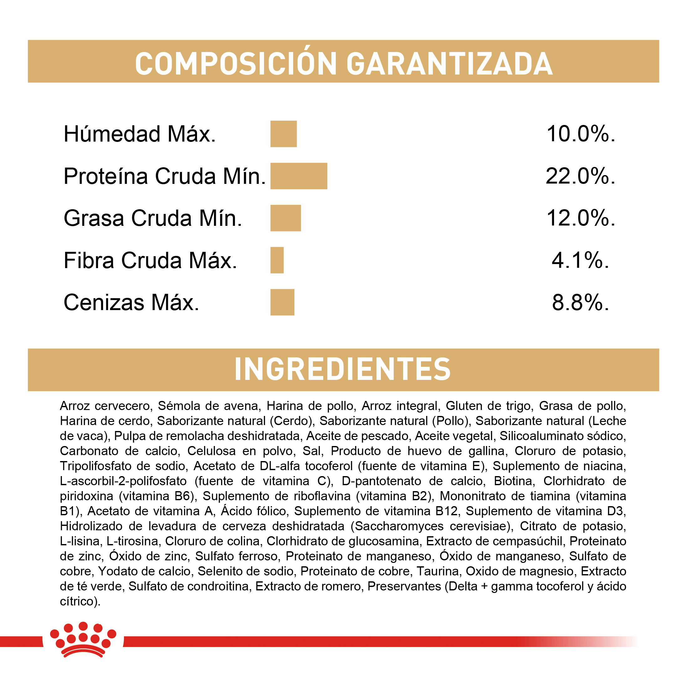 esta fórmula ayuda a reducir las fermentaciones intestinales que pueden dar lugar a trastornos digestivos, flatulencias y mal olor de las heces. Bulldog inglés adulto promueve una digestión saludable gracias a proteínas altamente digestibles (l.I.P.*), un contenido preciso de fibras y fuentes de carbohidratos de alta calidad. *proteínas seleccionadas por su elevada digestibilidad.”