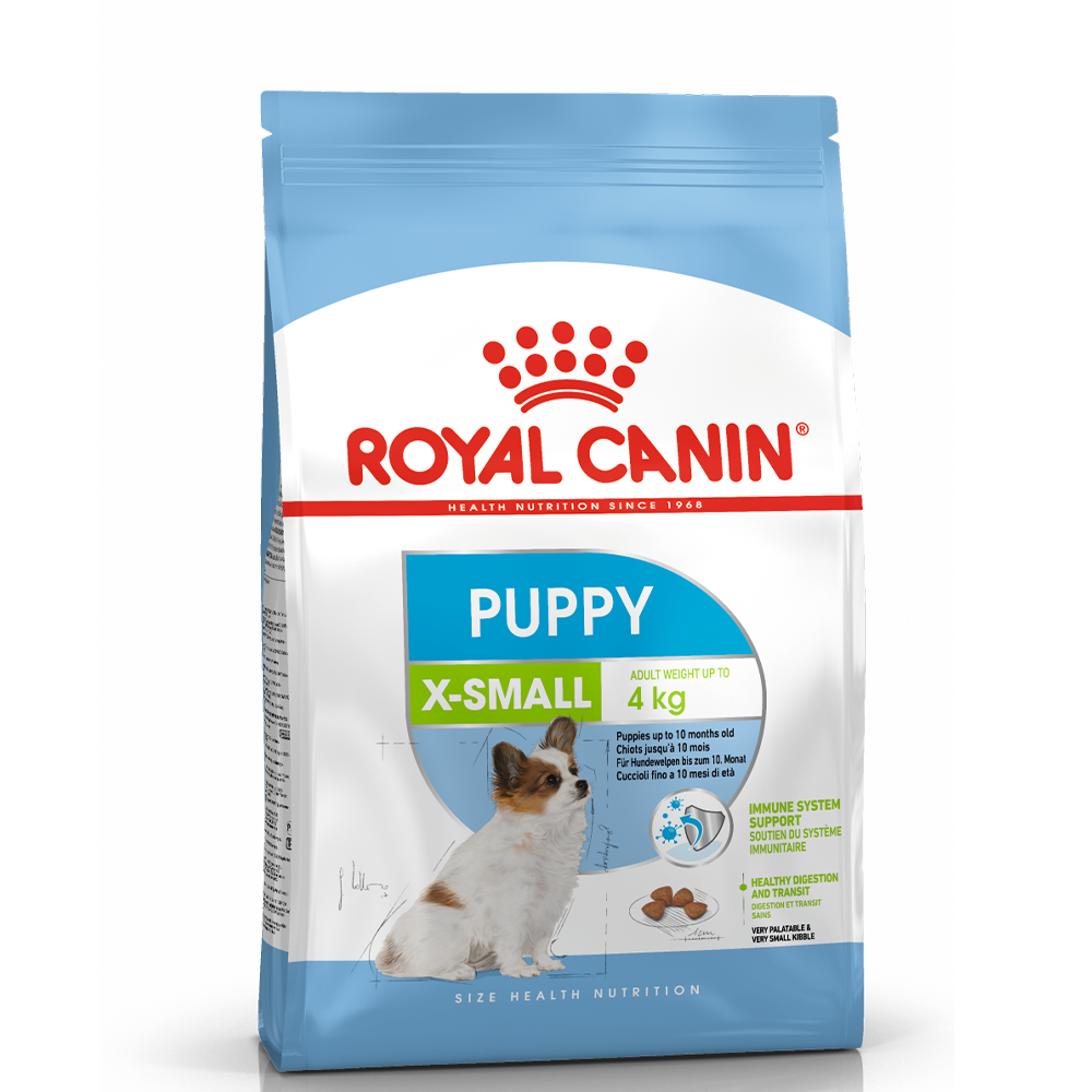 Royal canin x-small puppy está hecho a medida para cachorros de hasta 10 meses de edad con un peso adulto esperado de no más de 4 kg.