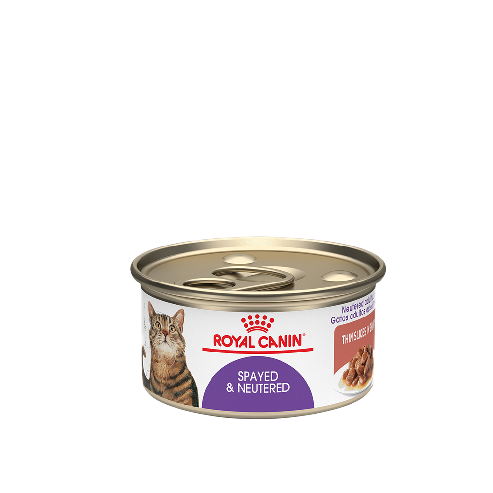 Royal canin spayed/neutered thin slices in gravy wet cat food está formulado para ayudar a mantener un peso saludable en gatos adultos de 1 año o más